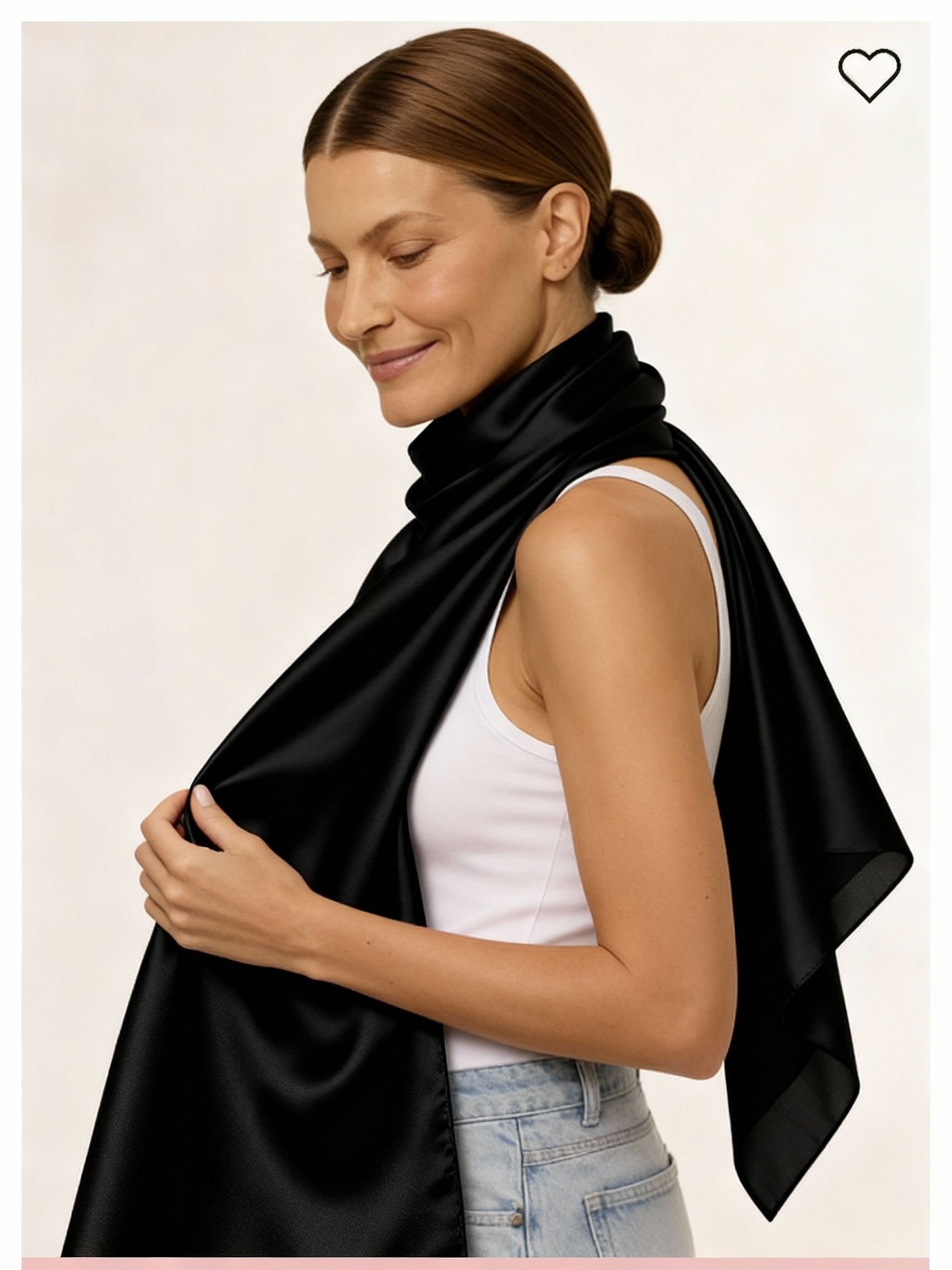 A Echarpe de Seda Pura – Noir Élégant (Black) da Pura Seda Beauty é a expressão máxima da elegância atemporal.